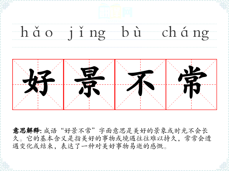 成语“好景不常”字面意思是美好的景象或时光不会长久。它的基本含义是指美好的事物或境遇往往难以持久,常常会遭遇变化或结束,表达了一种对美好事物易逝的感慨。