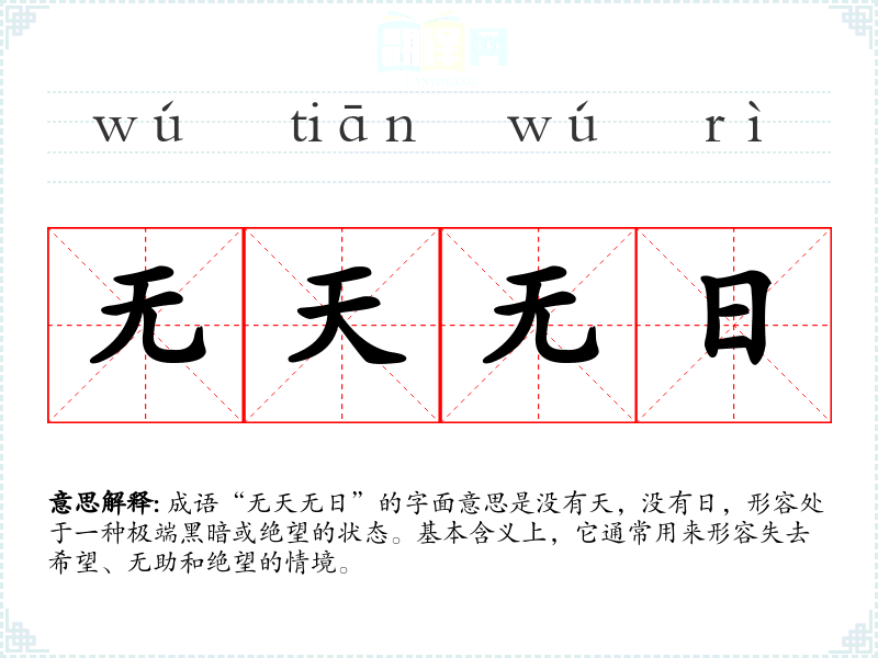 “无天无日”并没有特定的历史典故,但其字面构成可以追溯到古代文人对天地日月的崇敬。天与日是自然界的主宰,象征着光明与希望,因此“无天无日”暗示着一种极端消极和无助的状态。这种表达方式在古代文学中常见,反映了人们对生活困境的无奈。