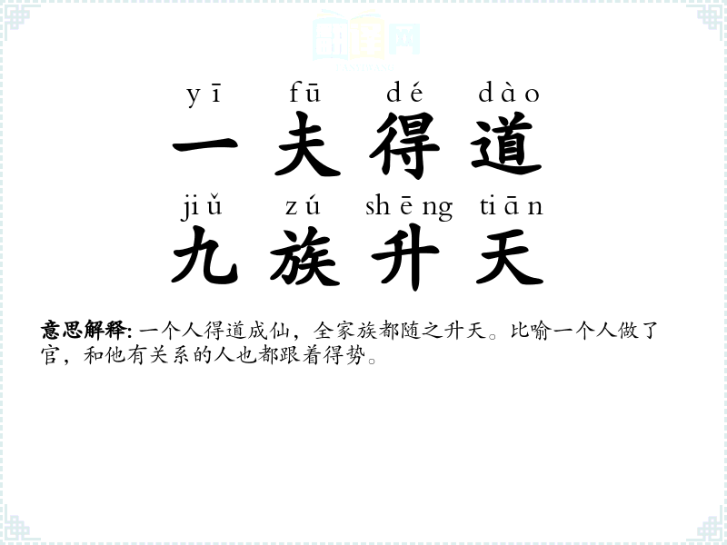 一个人得道面仙,全家连鸡、狗也都随之升天。比喻一个人做了官,和他有关系的人也都跟着得势。 |