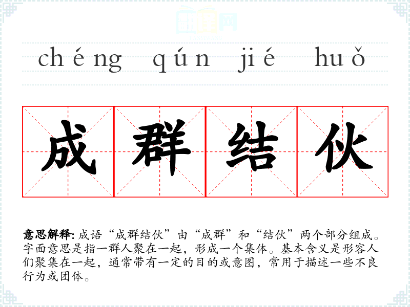 成语“成群结伙”由“成群”和“结伙”两个部分组成。字面意思是指一群人聚在一起,形成一个集体。基本含义是形容人们聚集在一起,通常带有一定的目的或意图,常用于描述一些不良行为或团体。