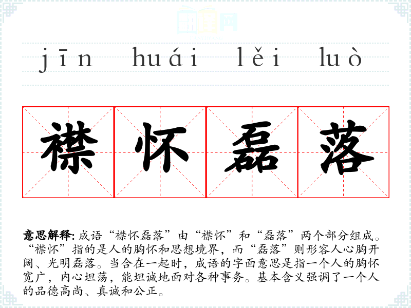 成语“襟怀磊落”由“襟怀”和“磊落”两个部分组成。“襟怀”指的是人的胸怀和思想境界,而“磊落”则形容人心胸开阔、光明磊落。当合在一起时,成语的字面意思是指一个人的胸怀宽广,内心坦荡,能坦诚地面对各种事务。基本含义强调了一个人的品德高尚、真诚和公正。