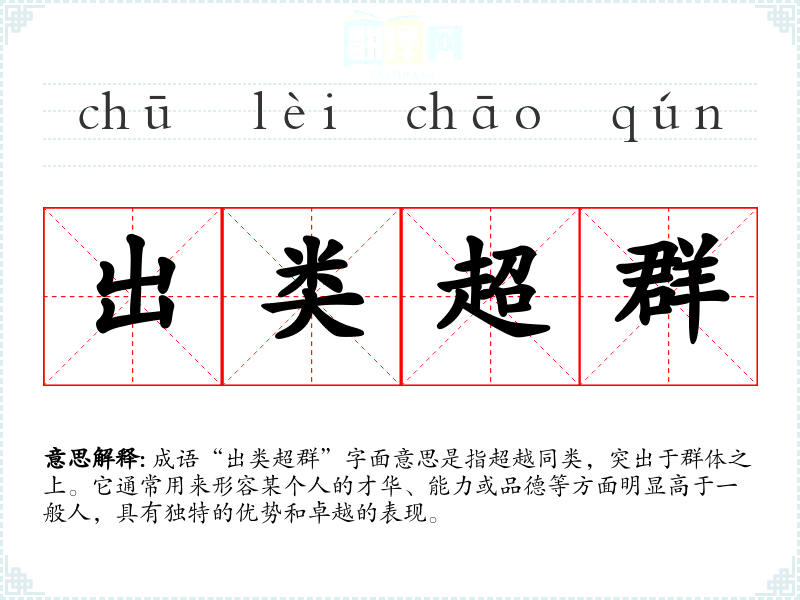 成语“出类超群”字面意思是指超越同类,突出于群体之上。它通常用来形容某个人的才华、能力或品德等方面明显高于一般人,具有独特的优势和卓越的表现。