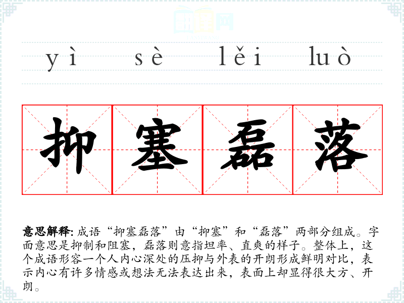 成语“抑塞磊落”由“抑塞”和“磊落”两部分组成。字面意思是抑制和阻塞,磊落则意指坦率、直爽的样子。整体上,这个成语形容一个人内心深处的压抑与外表的开朗形成鲜明对比,表示内心有许多情感或想法无法表达出来,表面上却显得很大方、开朗。