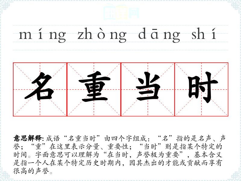 成语“名重当时”由四个字组成:“名”指的是名声、声誉;“重”在这里表示分量、重要性;“当时”则是指某个特定的时间。字面意思可以理解为“在当时,声誉极为重要”,基本含义是指一个人在某个特定历史时期内,因其杰出的才能或贡献而享有很高的声誉。