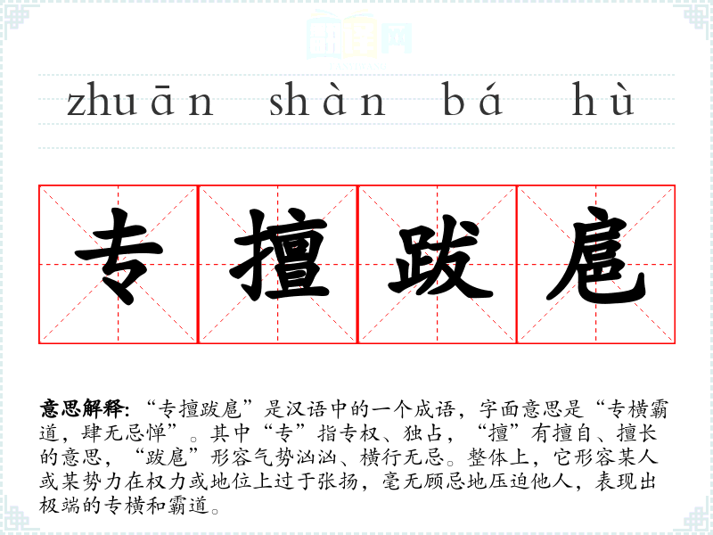 “专擅跋扈”是汉语中的一个成语,字面意思是“专横霸道,肆无忌惮”。其中“专”指专权、独占,“擅”有擅自、擅长的意思,“跋扈”形容气势汹汹、横行无忌。整体上,它形容某人或某势力在权力或地位上过于张扬,毫无顾忌地压迫他人,表现出极端的专横和霸道。