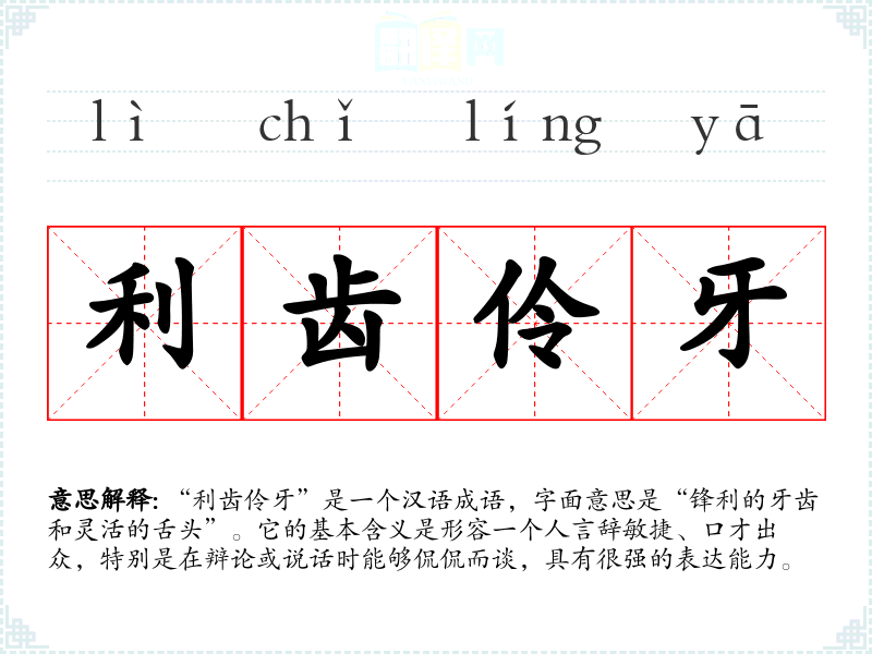 | 利齿能牙 | 口齿伶俐,能说会道。 |