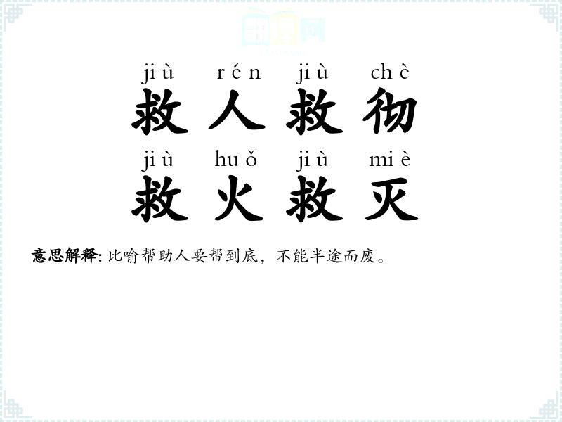 | 救人救彻,救火救灭 | 比喻帮助人要帮到底,不能半途而废。 |