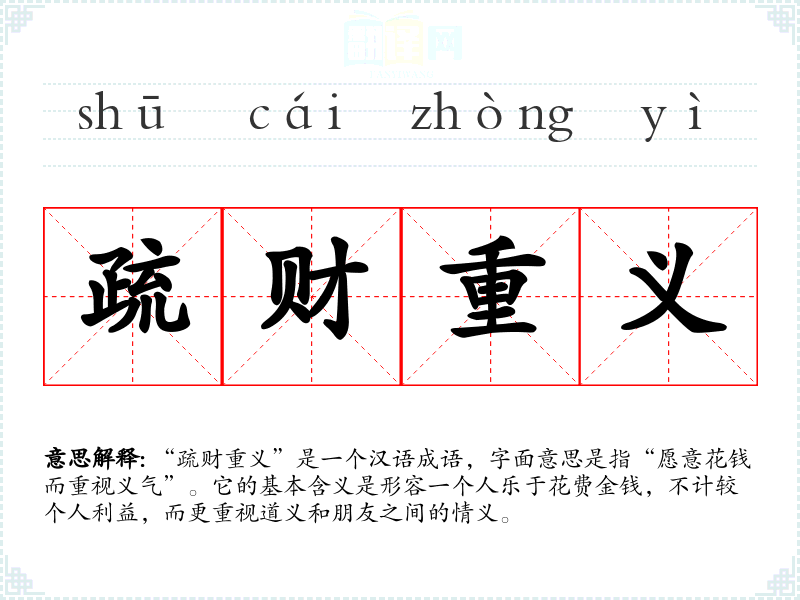 “疏财重义”是一个汉语成语,字面意思是指“愿意花钱而重视义气”。它的基本含义是形容一个人乐于花费金钱,不计较个人利益,而更重视道义和朋友之间的情义。