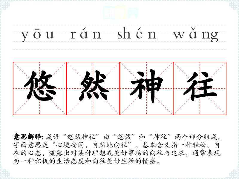 成语“悠然神往”由“悠然”和“神往”两个部分组成。字面意思是“心境安闲,自然地向往”。基本含义指一种轻松、自在的心态,流露出对某种理想或美好事物的向往与追求,通常表现为一种积极的生活态度和向往美好生活的情感。