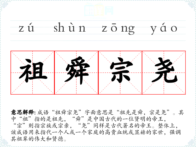 成语“祖舜宗尧”字面意思是“祖先是舜,宗是尧”。其中“祖”指的是祖先,“舜”是**古代的一位贤明的帝王,“宗”则指宗族或宗亲,“尧”同样是古代著名的帝王。整体上,该成语用来指代一个人或一个家庭的高贵血统或显赫的家世,强调其祖辈的伟大和贤德。