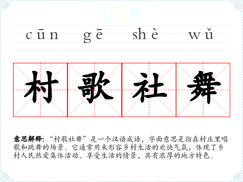 “村歌社舞”是一个汉语成语,字面意思是指在村庄里唱歌和跳舞的场景。它通常用来形容乡村生活的欢快气氛,体现了乡村人民热爱集体活动、享受生活的情景,具有浓厚的地方特色。