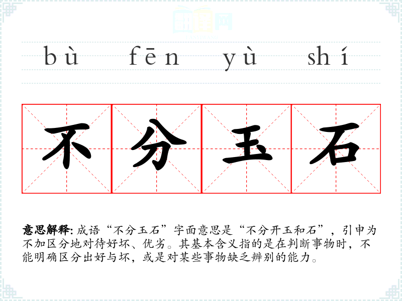 该成语源于古代对玉石的价值判断。在古代,玉被视为珍贵的宝石,而石则代表普通的石头。人们将玉和石进行比较,强调它们之间的差别,因此“不分玉石”便用来形容对事物的混淆和不加选择的态度。具体的文学出处可能不详,但这一成语的用法在古籍中多有涉及。