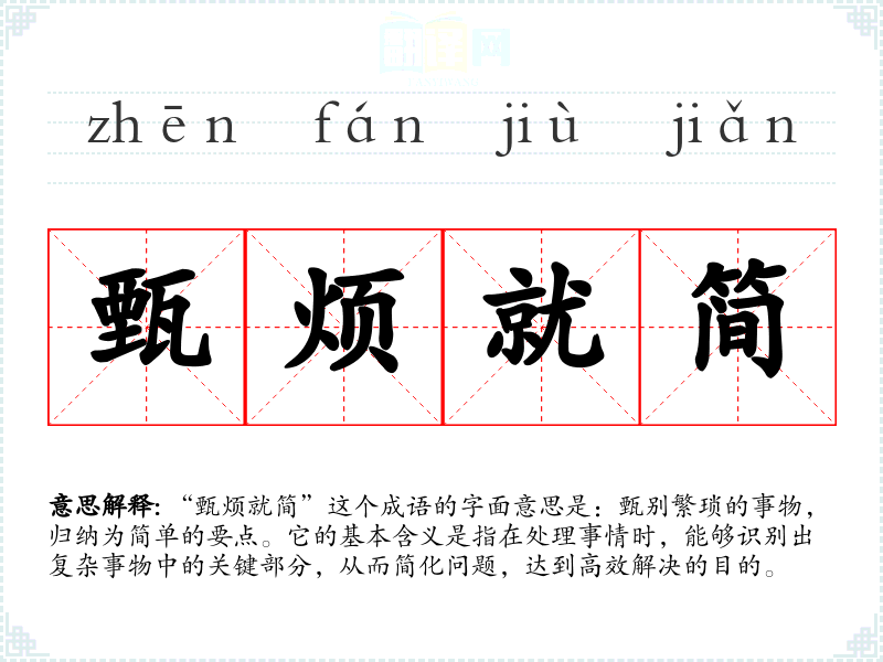 “甄烦就简”这个成语的字面意思是:甄别繁琐的事物,归纳为简单的要点。它的基本含义是指在处理事情时,能够识别出复杂事物中的关键部分,从而简化问题,达到高效解决的目的。