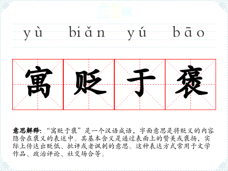 | 寓贬于褒 | 寓:寄托。在表面褒颂的词句下寓含讥讽的意思。 |
