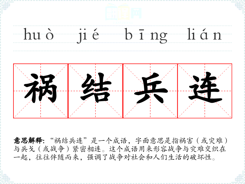 | 兵连祸结 | 兵:战争;连:接连;结:相联。战争接连不断,带来了无穷的灾祸。 |