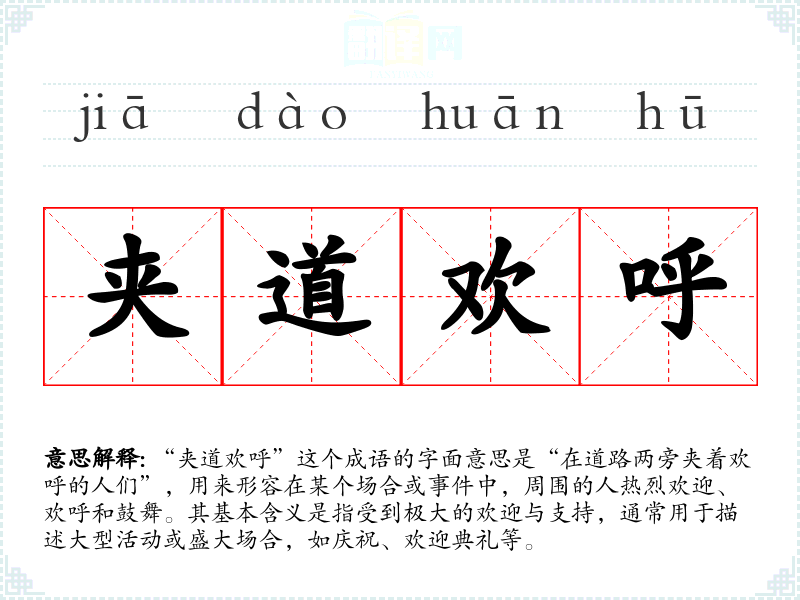 “夹道欢呼”这个成语的字面意思是“在道路两旁夹着欢呼的人们”,用来形容在某个场合或**中,周围的人热烈欢迎、欢呼和鼓舞。其基本含义是指受到极大的欢迎与支持,通常用于描述大型活动或盛大场合,如庆祝、欢迎典礼等。