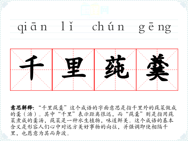 “千里莼羹”这个成语的字面意思是指千里外的莼菜做成的羹(汤)。其中“千里”表示距离很远,而“莼羹”则是指用莼菜煮成的羹汤,莼菜是一种水生植物,味道鲜美。这个成语的基本含义是形容人们心中对远方美好事物的向往,并强调即使相隔千里,也愿意为其而奔波。