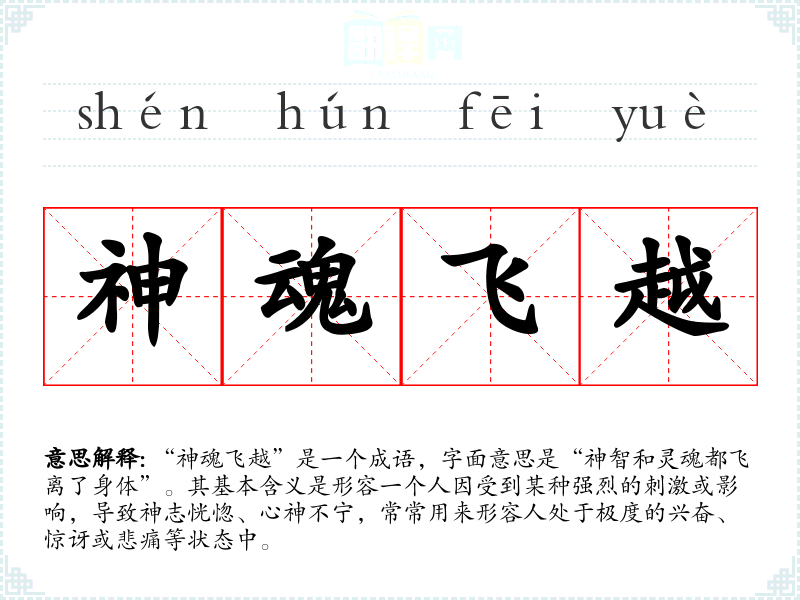 “神魂飞越”是一个成语,字面意思是“神智和灵魂都飞离了身体”。其基本含义是形容一个人因受到某种强烈的刺激或影响,导致神志恍惚、心神不宁,常常用来形容人处于极度的兴奋、惊讶或悲痛等状态中。
