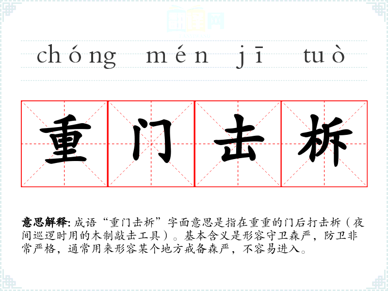 成语“重门击柝”字面意思是指在重重的门后打击柝(夜间巡逻时用的木制敲击工具)。基本含义是形容守卫森严,防卫非常严格,通常用来形容某个地方戒备森严,不容易进入。