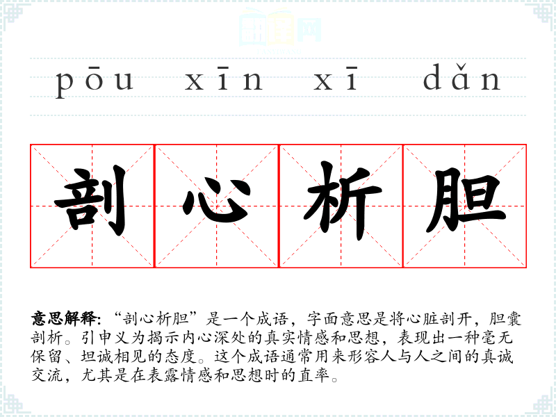 “剖心析胆”源于古代文化,体现了对情感真挚的追求。在古代文学中,常常有叙述人们剖析内心情感的作品,强调真诚与坦率的重要性。虽然具体的历史典故不详,但其含义在许多文人墨客的诗词中均有所体现,表现出对人性深度的探讨。