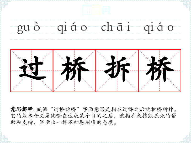 成语“过桥拆桥”字面意思是指在过桥之后就把桥拆掉。它的基本含义是比喻在达成某个目的之后,就抛弃或摧毁原先的帮助和支持,显示出一种不知恩图报的态度。