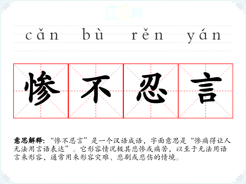 “惨不忍言”是一个汉语成语,字面意思是“惨痛得让人无法用言语表达”。它形容情况极其悲惨或痛苦,以至于无法用语言来形容,通常用来形容灾难、悲剧或悲伤的情境。