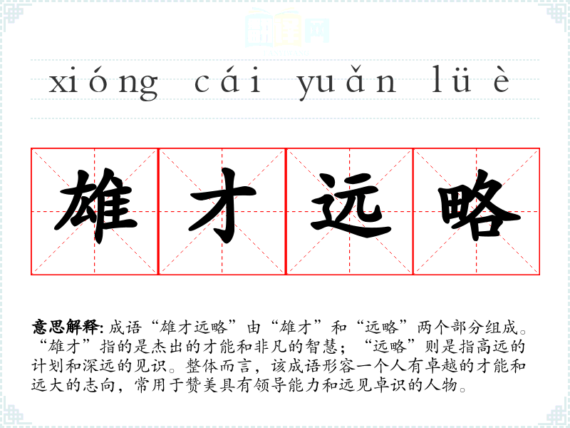 成语“雄才远略”由“雄才”和“远略”两个部分组成。“雄才”指的是杰出的才能和非凡的智慧;“远略”则是指高远的计划和深远的见识。整体而言,该成语形容一个人有卓越的才能和远大的志向,常用于赞美具有领导能力和远见卓识的人物。