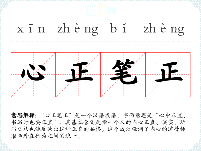 “心正笔正”是一个汉语成语,字面意思是“心中正直,书写时也要正直”。其基本含义是指一个人的内心正直、诚实,所写之物也能反映出这种正直的品格。这个成语强调了内心的道德标准与外在行为之间的统一。