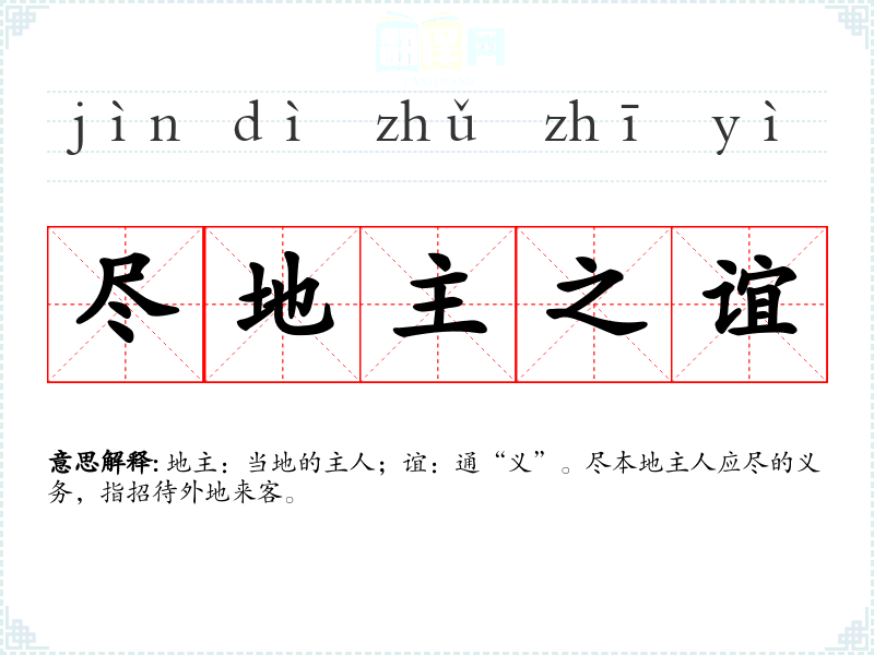 | 尽地主之谊 | 地主:当地的主人;谊:通“义”。尽本地主人应尽的义务,指招待外地来客。 |