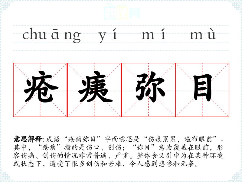 成语“疮痍弥目”字面意思是“伤痕累累,遍布眼前”。其中,“疮痍”指的是伤口、创伤;“弥目”意为覆盖在眼前,形容伤痛、创伤的情况非常普遍、严重。整体含义引申为在某种环境或状态下,遭受了很多创伤和苦难,令人感到悲惨和无奈。