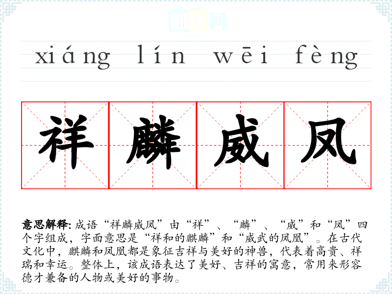 成语“祥麟威凤”由“祥”、“麟”、“威”和“凤”四个字组成,字面意思是“祥和的麒麟”和“威武的凤凰”。在古代文化中,麒麟和凤凰都是象征吉祥与美好的神兽,代表着高贵、祥瑞和幸运。整体上,该成语表达了美好、吉祥的寓意,常用来形容德才兼备的人物或美好的事物。