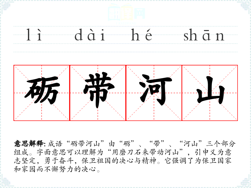 成语“砺带河山”由“砺”、“带”、“河山”三个部分组成。字面意思可以理解为“用磨刀石来带动河山”,引申义为意志坚定,勇于奋斗,保卫祖国的决心与精神。它强调了为保卫国家和家园而不懈努力的决心。