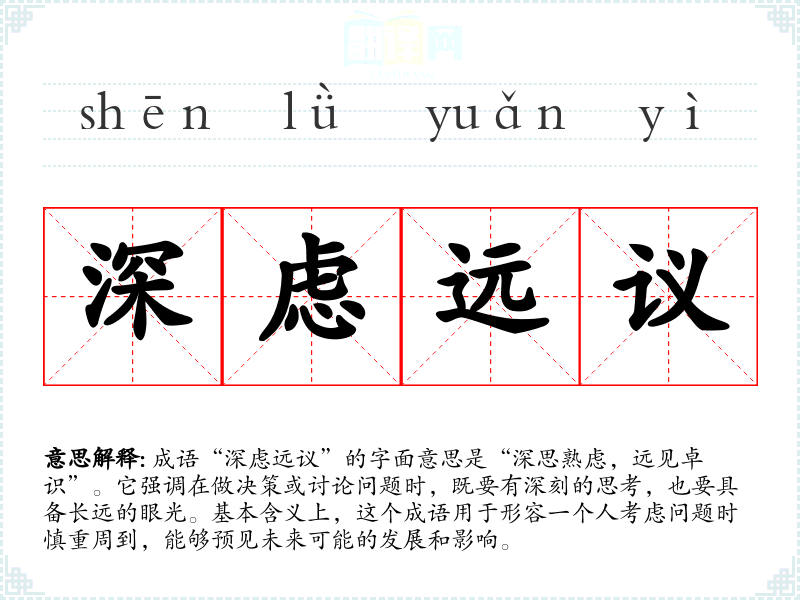 成语“深虑远议”的字面意思是“深思熟虑,远见卓识”。它强调在做决策或讨论问题时,既要有深刻的思考,也要具备长远的眼光。基本含义上,这个成语用于形容一个人考虑问题时慎重周到,能够预见未来可能的发展和影响。