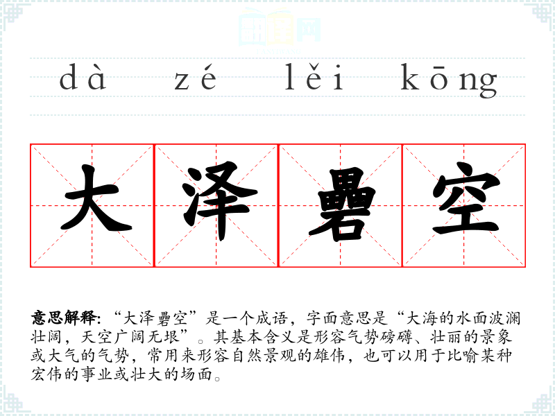 “大泽礨空”出自《诗经》,其中的“大泽”象征着广阔的水面,而“礨空”则形容天空的广阔和清澈。这个成语的起源可以追溯到古代诗歌中对自然景观的描绘,反映了古人对大自然的敬畏与赞美。