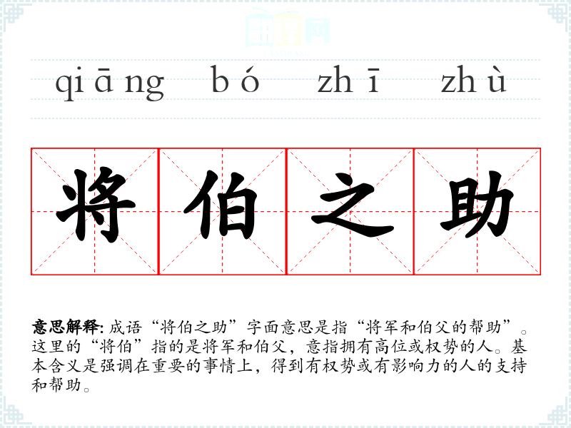 成语“将伯之助”字面意思是指“将军和伯父的帮助”。这里的“将伯”指的是将军和伯父,意指拥有高位或权势的人。基本含义是强调在重要的事情上,得到有权势或有影响力的人的支持和帮助。