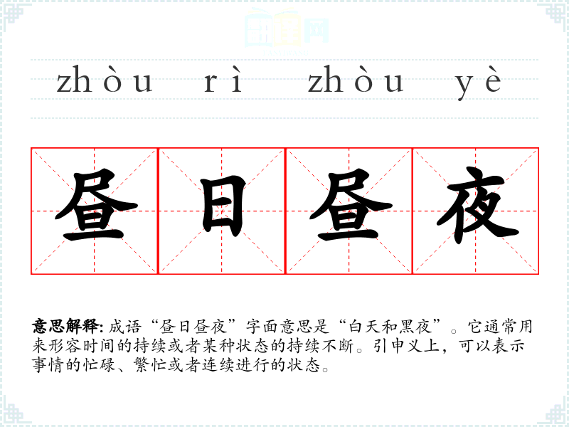成语“昼日昼夜”字面意思是“白天和黑夜”。它通常用来形容时间的持续或者某种状态的持续不断。引申义上,可以表示事情的忙碌、繁忙或者连续进行的状态。
