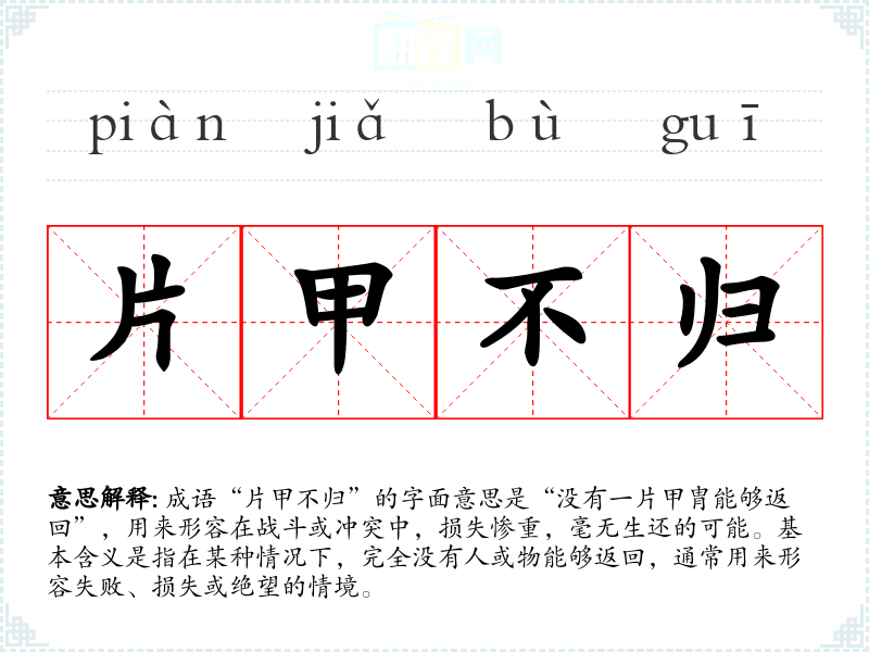 成语“片甲不归”的字面意思是“没有一片甲胄能够返回”,用来形容在战斗或冲突中,损失惨重,毫无生还的可能。基本含义是指在某种情况下,完全没有人或物能够返回,通常用来形容失败、损失或绝望的情境。
