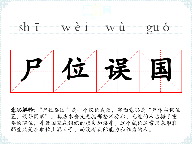“尸位误国”是一个汉语成语,字面意思是“尸体占据位置,误导国家”。其基本含义是指那些不称职、无能的人占据了重要的职位,导致国家或组织的损失和误导。这个成语通常用来形容那些只是在职位上混日子,而没有实际能力和作为的人。