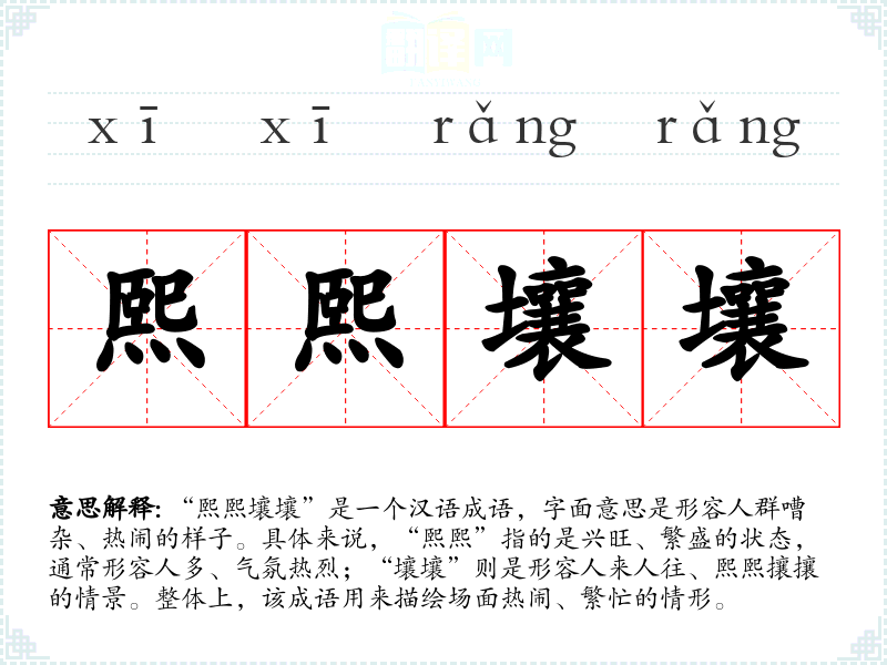 | 熙熙壤壤 | 形容人来人往,喧闹纷杂。壤,通“攘”。 |