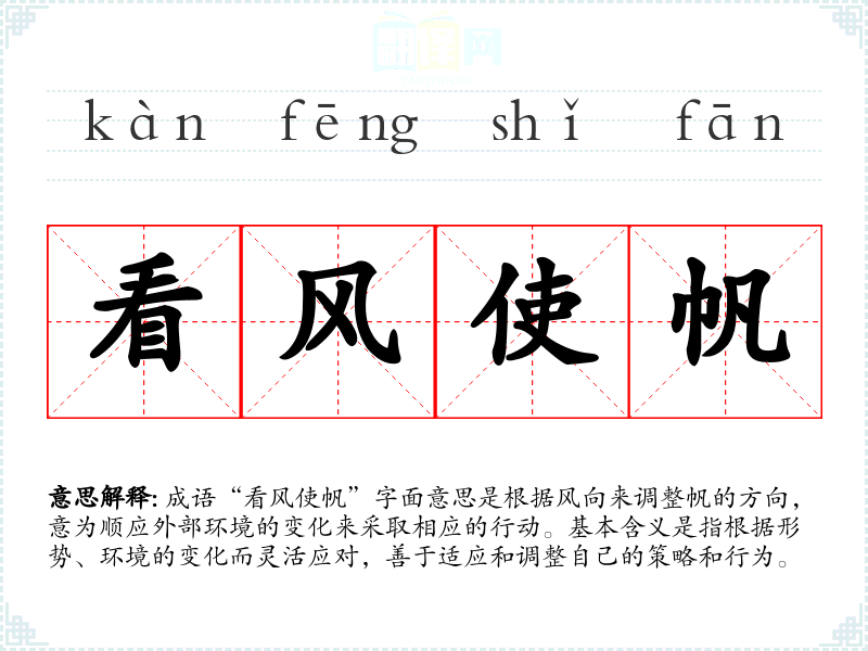 成语“看风使帆”字面意思是根据风向来调整帆的方向,意为顺应外部环境的变化来采取相应的行动。基本含义是指根据形势、环境的变化而灵活应对,善于适应和调整自己的策略和行为。