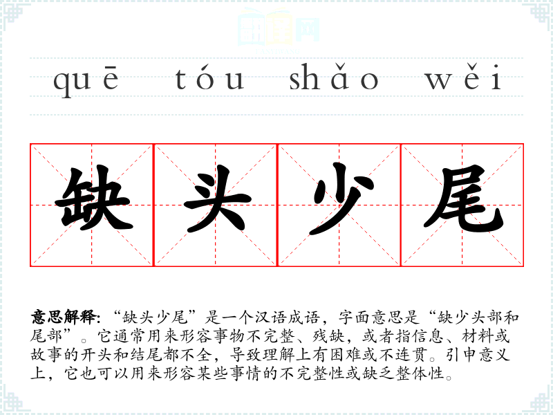 “缺头少尾”是一个汉语成语,字面意思是“缺少头部和尾部”。它通常用来形容事物不完整、残缺,或者指信息、材料或故事的开头和结尾都不全,导致理解上有困难或不连贯。引申意义上,它也可以用来形容某些事情的不完整性或缺乏整体性。