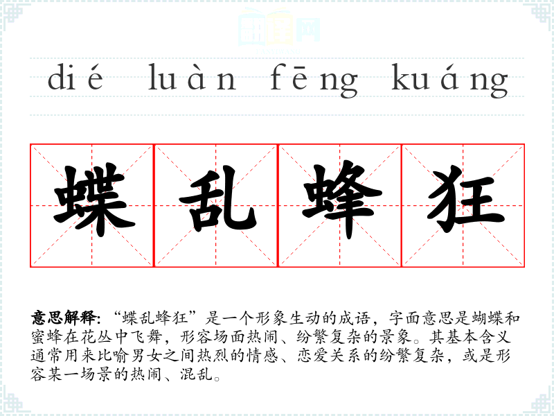 “蝶乱蜂狂”是一个形象生动的成语,字面意思是蝴蝶和蜜蜂在花丛中飞舞,形容场面热闹、纷繁复杂的景象。其基本含义通常用来比喻男女之间热烈的情感、恋爱关系的纷繁复杂,或是形容某一场景的热闹、混乱。