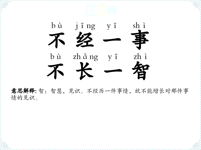智:智慧,见识。不经历一件事情,就不能增长对那件事情的见识。同“不经一事,不长一智”。 |