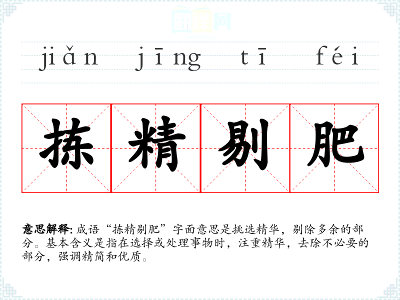 成语“拣精剔肥”字面意思是挑选精华,剔除多余的部分。基本含义是指在选择或处理事物时,注重精华,去除不必要的部分,强调精简和优质。