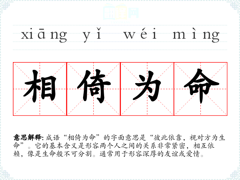 成语“相倚为命”的字面意思是“彼此依靠,视对方为生命”。它的基本含义是形容两个人之间的关系非常紧密,相互依赖,像是生命般不可分割。通常用于形容深厚的友谊或爱情。