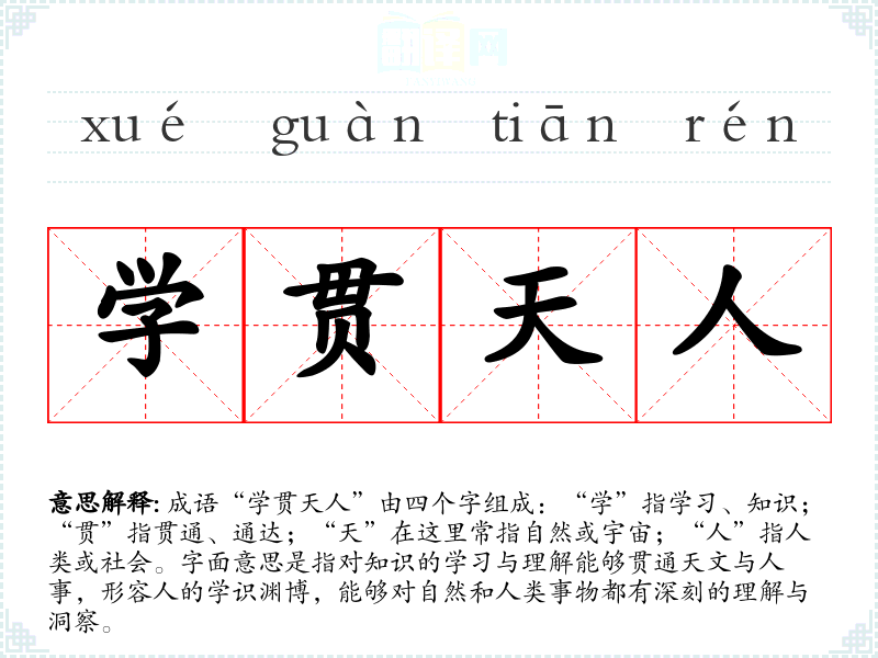 成语“学贯天人”由四个字组成:“学”指学、知识;“贯”指贯通、通达;“天”在这里常指自然或宇宙;“人”指人类或社会。字面意思是指对知识的学与理解能够贯通天文与人事,形容人的学识渊博,能够对自然和人类事物都有深刻的理解与洞察。