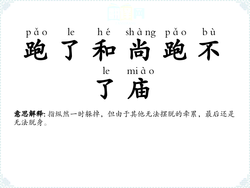 指纵然一时躲掉,但由于其他无法摆脱的牵累,最后还是无法脱身。同“跑了和尚跑不了庙”。 |