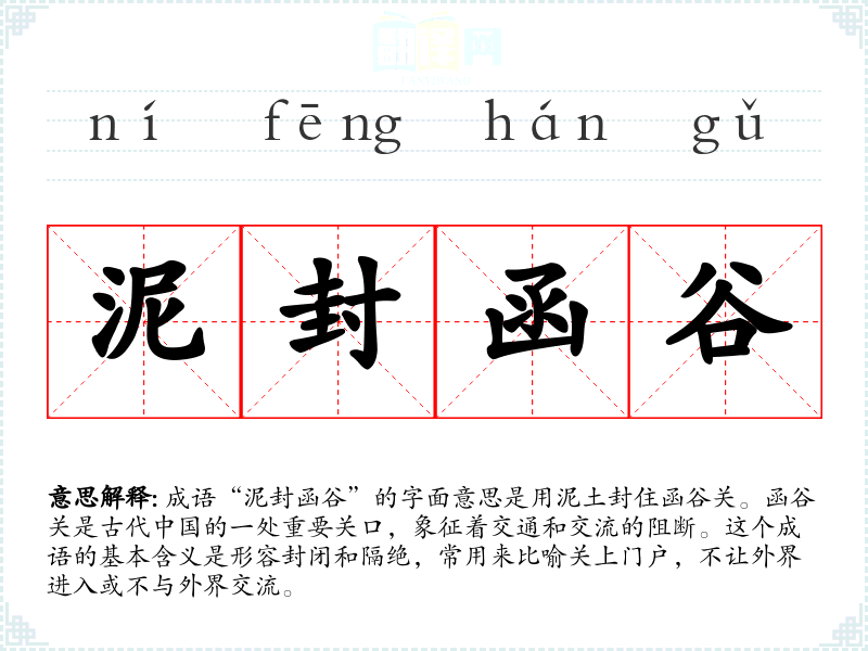 成语“泥封函谷”的字面意思是用泥土封住函谷关。函谷关是古代**的一处重要关口,象征着交通和交流的阻断。这个成语的基本含义是形容封闭和隔绝,常用来比喻关上门户,不让外界进入或不与外界交流。