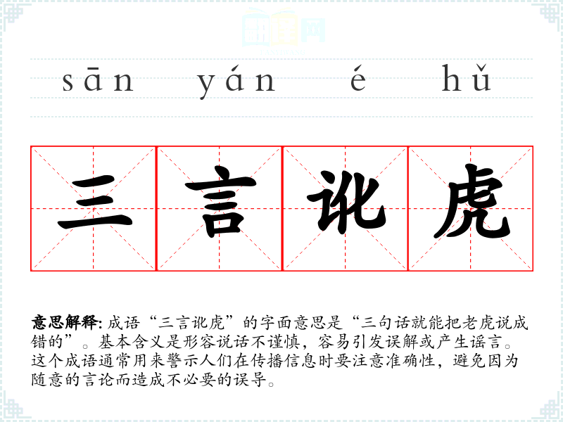 成语“三言讹虎”的字面意思是“三句话就能把**说成错的”。基本含义是形容说话不谨慎,容易引发误解或产生谣言。这个成语通常用来警示人们在传播信息时要注意准确性,避免因为随意的言论而造成不必要的误导。