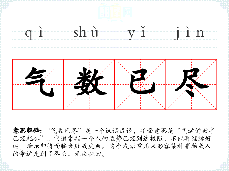 “气数已尽”是一个汉语成语,字面意思是“气运的数字已经耗尽”。它通常指一个人的运势已经到达极限,不能再继续好运,暗示即将面临衰败或失败。这个成语常用来形容某种事物或人的命运走到了尽头,无法挽回。